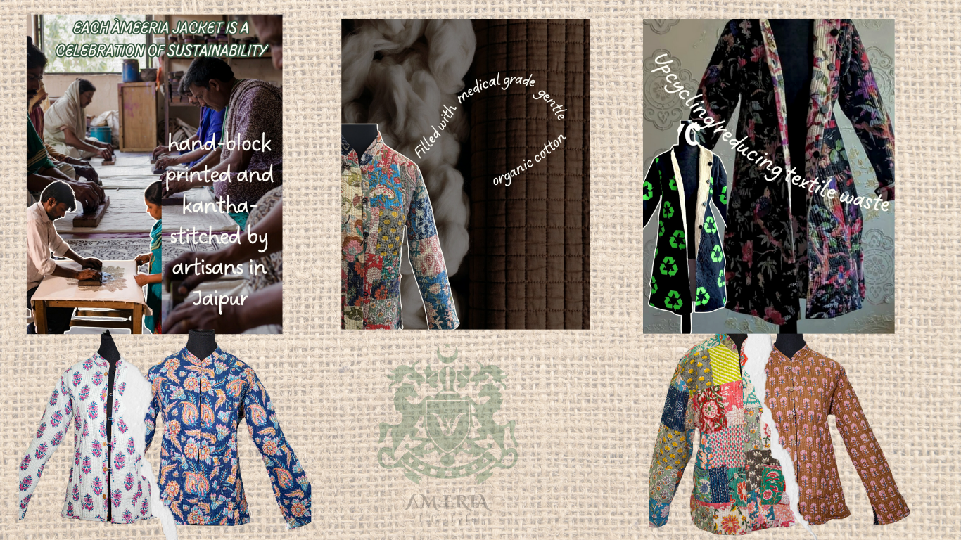 Founded by Naoma Khan, Ameeria Lifestyle celebrates craftsmanship over trends. Each reversible quilted jacket is handcrafted in small batches in Jaipur, India, by small-scale industry craftsmen using upcycled premium fabrics and organic cotton filling. We create timeless pieces designed to outlast seasons and trends — because noble fashion means investing in quality, not quantity.